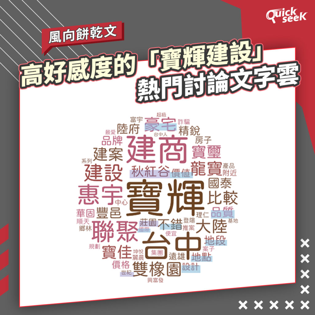 在聲量與好感度的交叉觀察中,寶輝建設呈現出相對不同的討論輪廓。雖然整體討論聲量並非市場最高,但相關討論關鍵字多集中於「品質」、「設計」、「地段」、「建築價值」等購屋族高度在意的核心條件,與市場主流需求高度重疊。