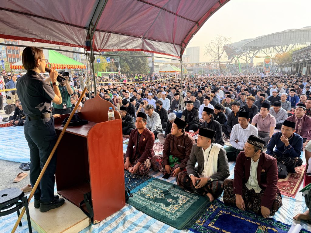 2026年印尼開齋節於本(3)月21日清晨6時,在臺中火車站舊站前廣場熱鬧展開,大批穆斯林民眾齊聚虔誠禮拜,現場人潮綿延壯觀,晨光撒下一道金黃,古色古香的廣場與虔誠禮拜人們,相映出莊嚴、平和的春日美景。在人群之中,一段特別的開場引發關注——中市警一分局外事巡官田佩玉,以印尼語「Selamat pagi, saya polisi dari Taichung. Nama saya Claudia. Selamat datang di Taichung.」(中文:早安,我是來自臺中的警察,我的名字是Claudia,歡迎來到臺中)向在場上千名移工與新住民穆斯林朋友親切問候,驚艷全場,獲得熱烈回應,瞬間拉近彼此距離。
