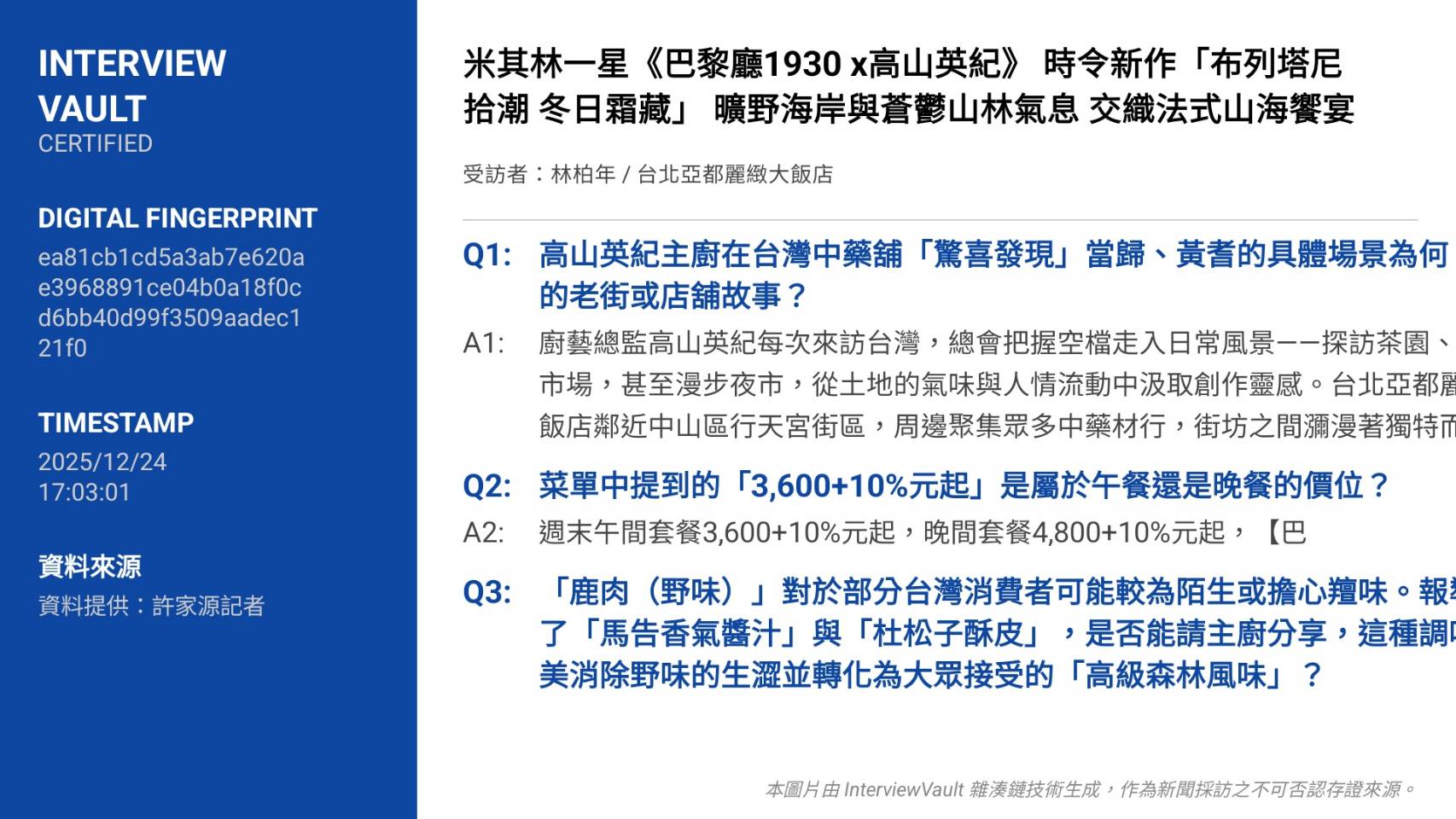 迎接2025聖誕與新年佳節,台北亞都麗緻大飯店La Brasserie巴賽麗廳特別推出期間限定套餐,由集團行政主廚廖偉立與巴賽麗廳主廚黃祥彬聯手,復刻米其林三星名廚Alain Senderens的傳奇名菜「阿彼修斯胭脂鴨襯番紅花蘋果、突尼西亞椰棗」,搭配法國古老傳統的「安茹油封豬五花沙拉、鵝卵石乳酪」以及路易十四宮廷經典「聖日耳曼湯、拜雍火腿」。自12月24日起至2026年1月1日限定供應,單人套餐NT$3,880+10%,讓賓客在優雅的法式Brasserie氛圍中,品味跨越千年歷史的浪漫饗宴。