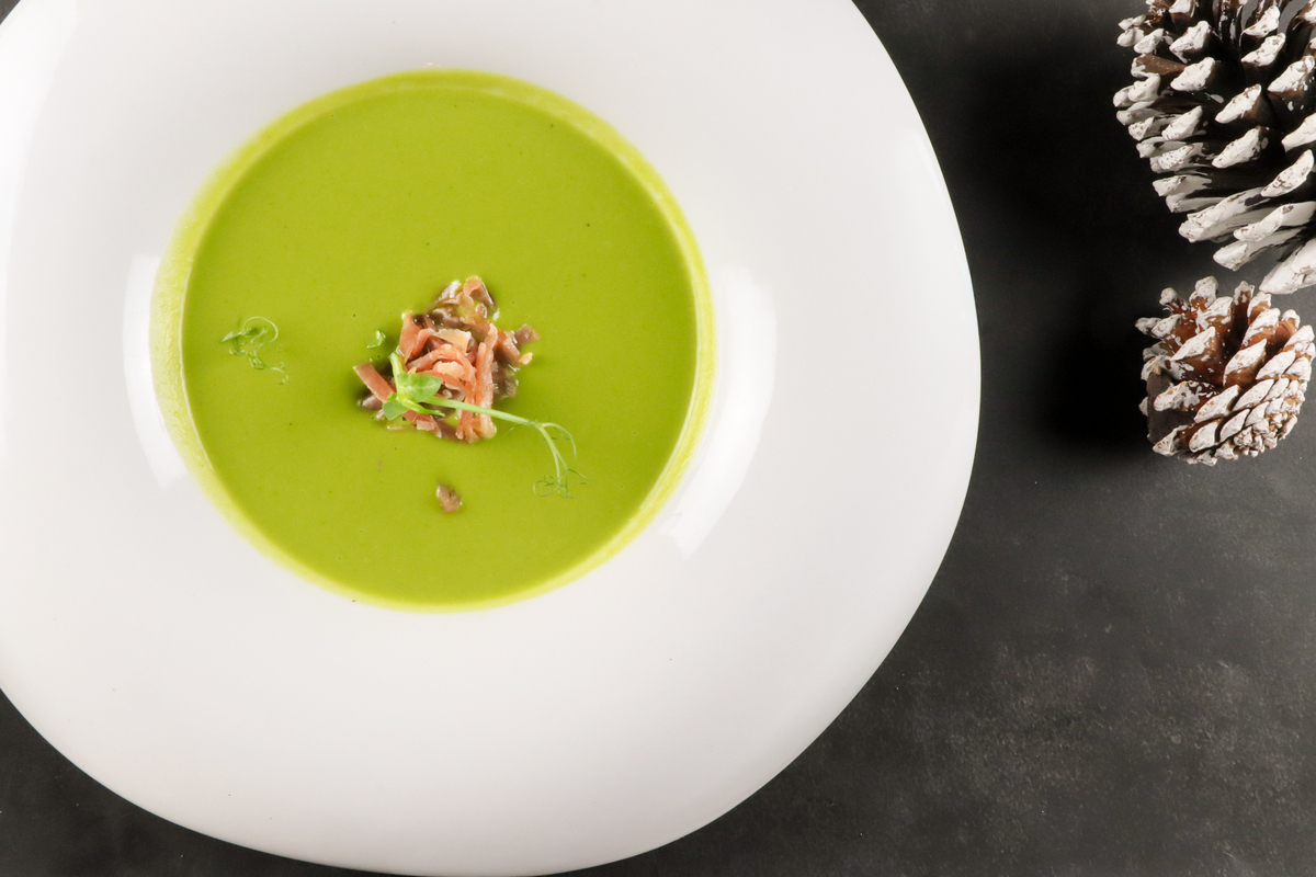 另一亮點安茹油封豬五花則以鴨油取代傳統豬脂,先油封後油炸,肉質豐潤扎實卻不厚重,佐紅酒油醋、清新沙拉、堅果碎、無花果與法國羅亞爾地區鵝卵石起司,風味清爽優雅。開胃的聖日耳曼湯則保留豌豆清甜,短時烹煮攪打成綿密翠綠湯體,鋪上拜雍火腿增添迷人鹹香。巴賽麗廳以黃銅欄杆、布根地紅座椅營造美好年代氛圍,適合節慶聚會,預約從速。