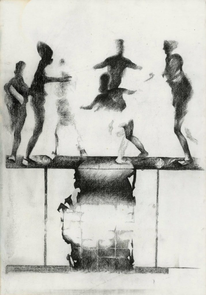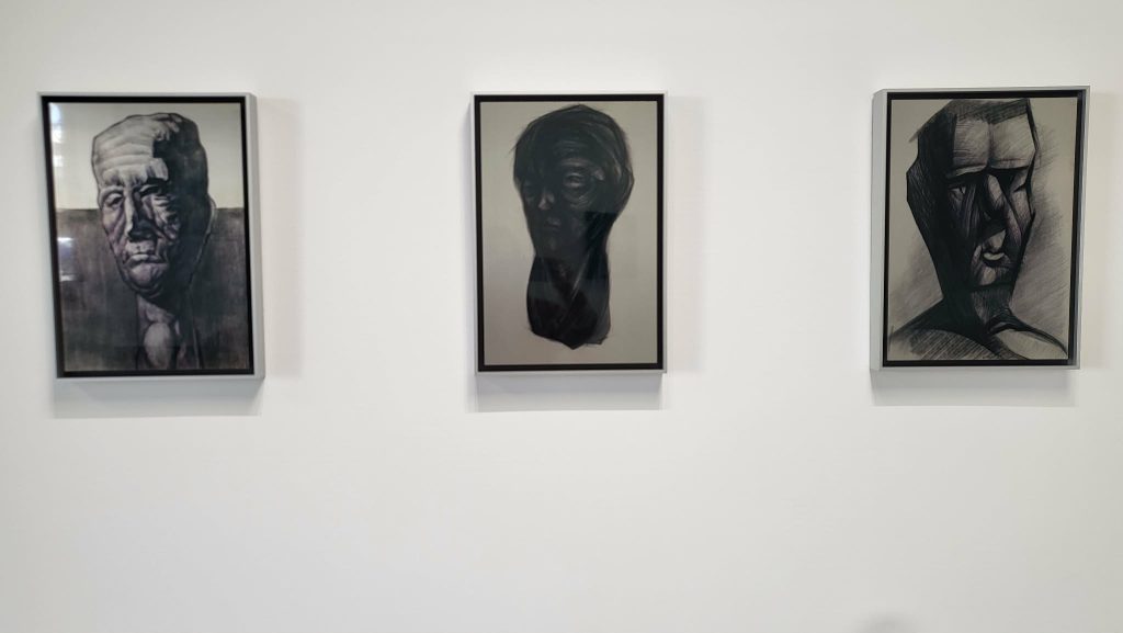 此外,有許多黑白素描的舊作,在這些作品中,自畫像的人頭與體態意象逐漸從金色背景浮現。「這些身體並非肖像式的再現,而更像是都市能量壓力下的精神 映像。……身體不再僅是形象,而成為一種痕跡的存在,一種在火與塵之間被記錄下來的存在狀態。黑白因此成為火之後的殘留,也是火之前的準備。」