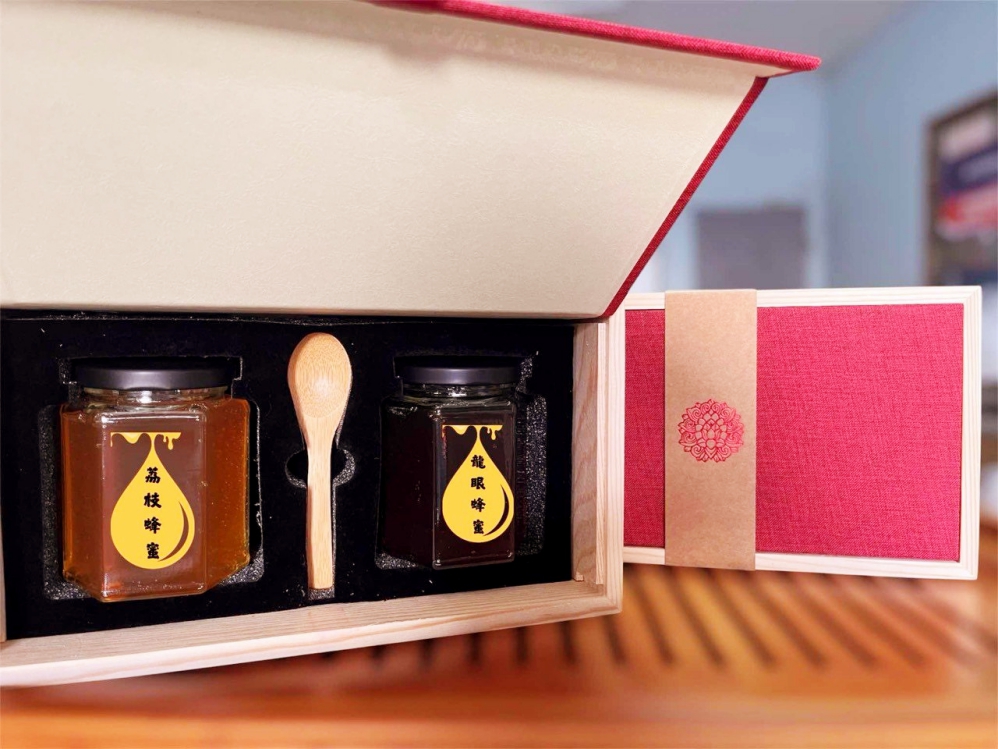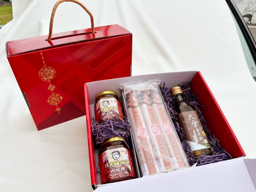 苗栗縣在地文化推廣協會「金蜜滿堂禮盒」嚴選產地龍眼蜜與百花蜜,象徵甜蜜富足、滿堂生輝;同樣來自苗栗之三義鄉雙潭農業文旅產業發展協會「茶油盈福麵」,以日曬麵線搭配苦茶油,寓意福氣綿延、健康盈滿;招福則由苗栗縣西湖鄉休閒產業發展協會「西湖有寶禮盒」呈現,集結地產蜂蜜、油柑糖與柚子蔘,展現山城自然風味,寓意聚寶招福。每款禮盒由不同地區的在地團體精心製作,歡迎民眾透過購買行動將新年祝福從家庭延伸至社區,一同支持地方產業與在地就業!