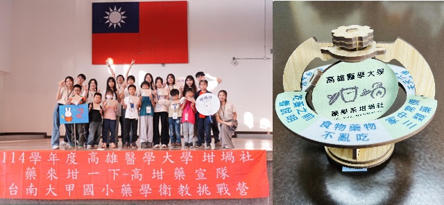 這次活動的一大亮點是坩堝社設計的「衛教轉盤」。轉盤將健康觀念與正確用藥知識濃縮成朗朗上口的口訣,以鮮明、活潑的方式呈現。營隊最後,學生將衛教轉盤作為禮物送給全體學童,期盼孩子能將所學知識帶回家,與家人分享用藥安全的重要性,進一步擴大坩堝社的服務影響力。高醫藥學院院長楊世群指出,藥物與食物的交互作用是成人也常忽略的議題,更需要從小扎根。他表示:「如果孩子能從小知道吃藥不能隨便配果汁或含咖啡因飲品,不僅能保護自己,也能保障家人的用藥安全。」院長並肯定學生將複雜的藥學知識轉化為活動與教材,讓學童能把關鍵觀念帶回家分享,進一步擴散正確用藥的影響力。坩堝社社長楊宜庭則表示,這次出隊特別更新並深化課程內容,將「食物藥物交互作用」與「均衡飲食」等主題以更貼近日常生活的方式呈現,把艱深的背景知識轉化為小學生也能理解的互動教材,讓孩子在輕鬆氛圍中建立正確用藥概念。她強調,衛教轉盤不僅讓學童透過動手組裝加深印象,更成為兩天營隊中難忘的學習紀念。坩堝社將持續推動藥學教育,以創意、專業與服務精神陪伴孩子成長,讓正確用藥觀念與健康知識從校園延伸至家庭與社區,促進更健康、安全的生活環境。