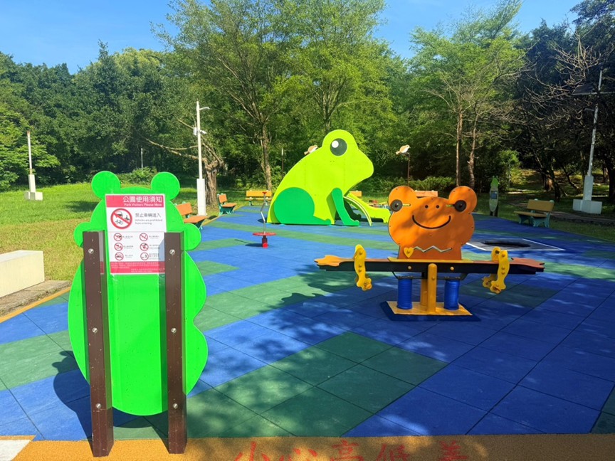 百福公園兒童遊戲場更新以公園既有生態環境為基礎,透過對園區濕地生態的觀察,選擇具有代表性的赤蛙與豆娘作為主要設計元素,轉化為遊戲設施與整體空間設計語彙。在規劃設計過程中,都市發展處特別召開地方說明會,廣納在地民意,邀集里長及議員共同參與討論,針對遊戲設施配置、安全性及使用需求提出多項建議,作為設計優化的重要依據,使遊戲場更貼近地方需求與使用者期待。遊戲場內以赤蛙造型的高塔溜滑梯為主體,結合攀爬功能,提供孩童多元挑戰與探索體驗,並設置鞦韆設施及彈跳床,滿足不同年齡層使用需求,增添動態遊戲的趣味性與互動性。