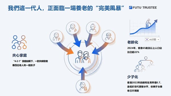 香港人口老齡化加速,2024 年 65 歲及以上長者已佔總人口逾 22%。「4-2-1」家庭結構與少子化趨勢令「養兒防老」模式難以為繼。中產家庭正面臨三大養老痛點:長壽風險(錢比人先用完)、失智失能風險(錢用不了),以及市場波動下的財富侵蝕風險。傳統家族信託高門檻、高收費及繁瑣流程,則讓絕大多數中產家庭望而卻步。