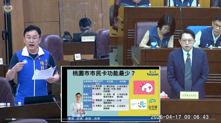 楊朝偉議員表示,對照其他直轄市,「台北通」已整合身分驗證、繳費、申辦、場館預約,甚至醫療與疫苗資訊查詢,「台中通」亦持續擴充市政服務功能;相較之下,桃園市民卡目前仍以卡片功能、停車與點數回饋為主,疫苗紀錄、場館預約等服務分散於不同平台,整體使用體驗明顯落後。