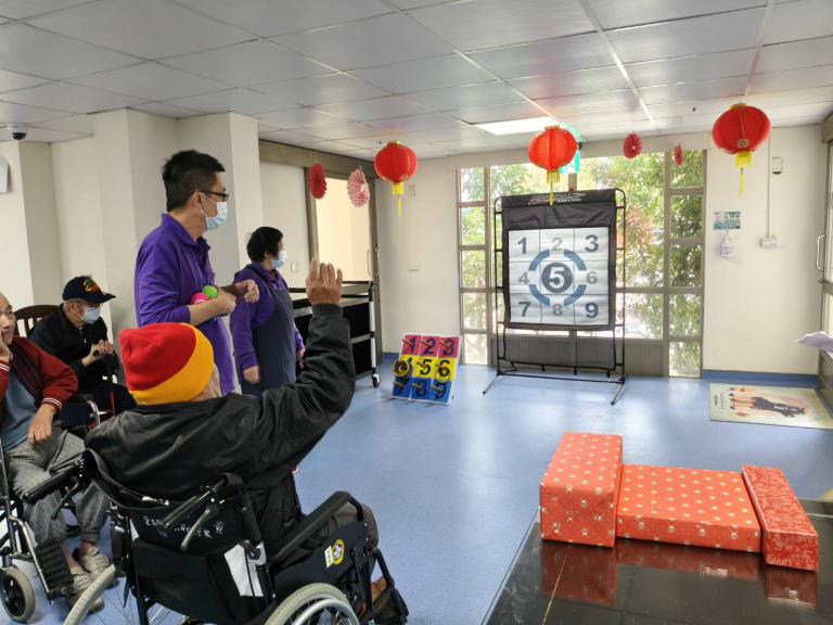 護理師蔡佩叡表示,這次活動特別融入競賽元素,依長輩們能力分組進行友誼賽,過程中不僅考驗手眼協調與專注力,也增添挑戰性與趣味性。「丟球九宮格」透過準確投擲累積分數,訓練上肢肌力與反應及控制能力;「數字套圈圈」則結合數字、顏色辨識與簡易計算,刺激認知功能,讓住民在遊戲中自然學習與運動,有助於延緩身體機能與認知退化。