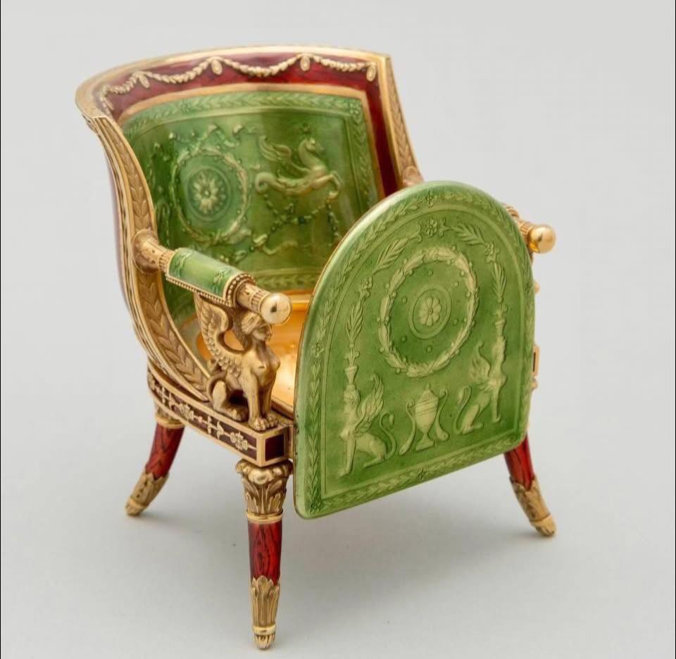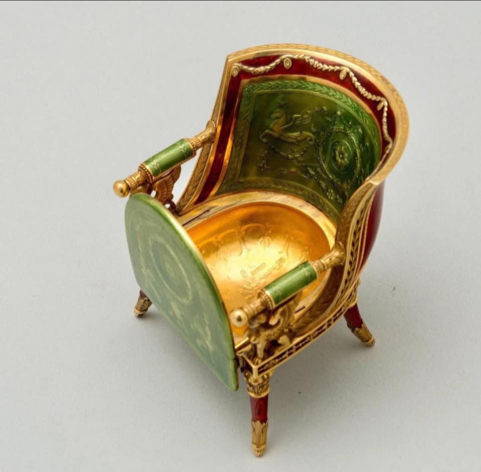 由法貝熱工坊大師 Henrik Wigström 於 1911 年打造的小椅子,並非單純的裝飾品,而是一件充滿驚喜的「黃金糖果盒」。