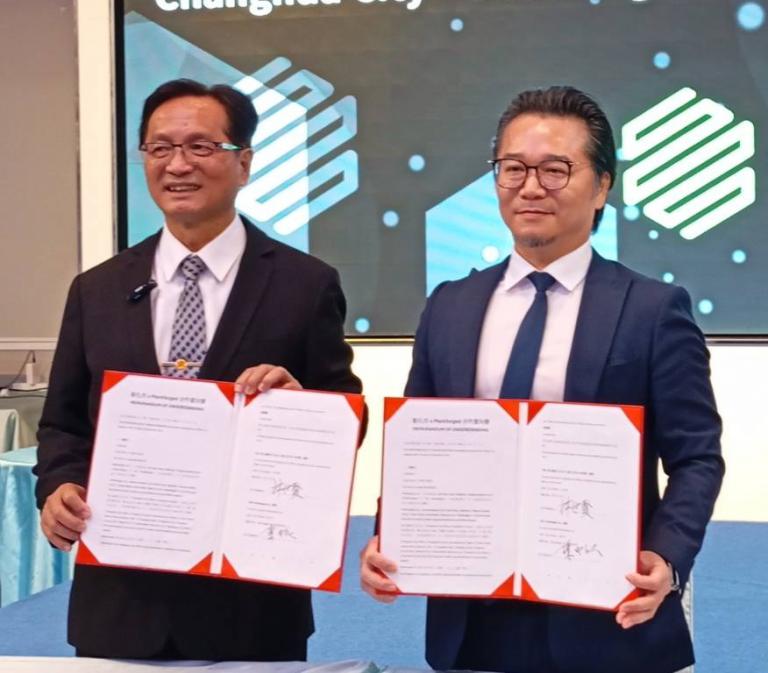 ▲「彰化無人載具聯盟主席」-彰化市長林世賢,8日與全球工業級3D列印領導廠商美商Markforged大中華區總經理陳中欣簽署合作備忘錄(MOU),讓「彰化製造」有機會飛向世界。(圖╱記者孔亮云攝)
