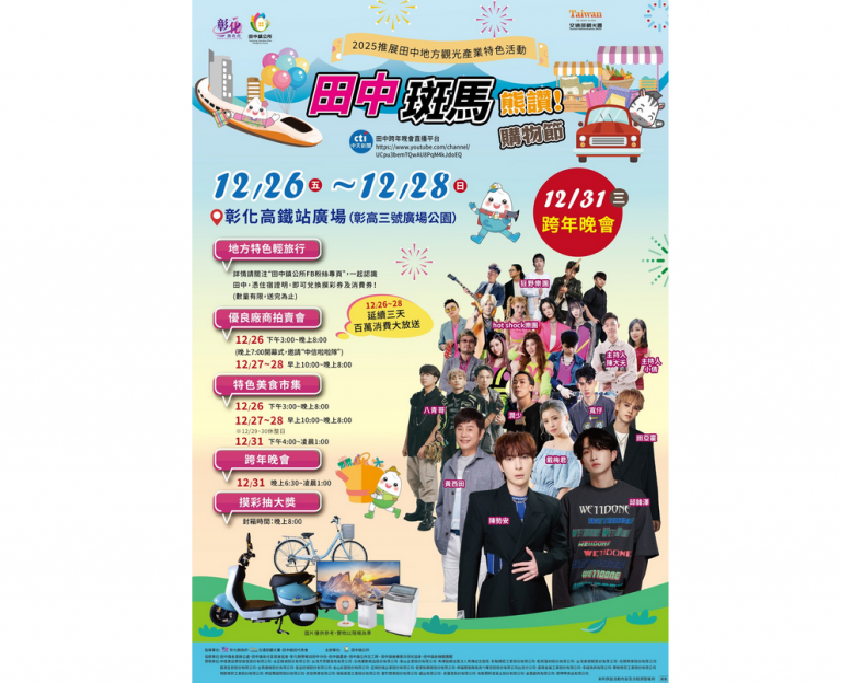 彰化縣田中鎮被譽為擁有「好山、好水、好米、好空氣、好長壽」的五好宜居小鎮,為推廣在地觀光資源與產業特色,鎮公所將於12月26日至28日及31日在高鐵彰化站後站廣場(彰高三號廣場公園) 舉辦「2025推展田中觀光產業特色活動-田中《斑馬》熊讚!購物節」,結合購物、市集、特色輕旅行與跨年晚會等多元內容,吸引人潮走入田中、活絡地方商圈,為歲末小鎮注入熱鬧與新活力。