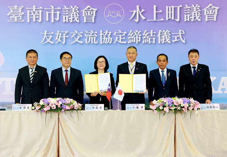 臺南市議會與日本群馬縣水上町議會20日正式簽署友好交流協定,象徵兩地在多年友好互動上邁入更深度的夥伴關係。簽署儀式由臺南市議會議長邱莉莉與水上町議會議長小林洋共同代表議會簽署,黃偉哲市長與水上町町長阿部賢一親臨現場見證,場面隆重而溫馨。