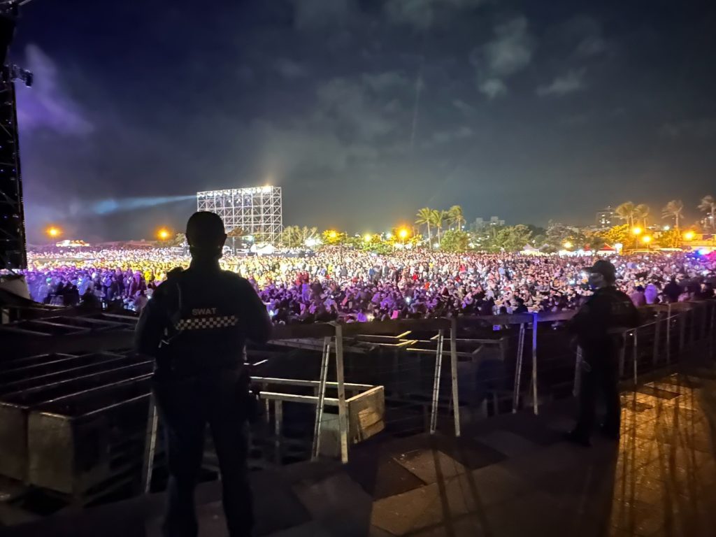 另為確保跨年活動結束後夜間治安平穩,警方亦持續堅守至最後一刻,活動結束後巡邏警力接續加強海濱公園及周邊道路巡邏,並通報凌晨時段警力強化超商及易飲酒滋事場所巡守,防範治安事故發生。