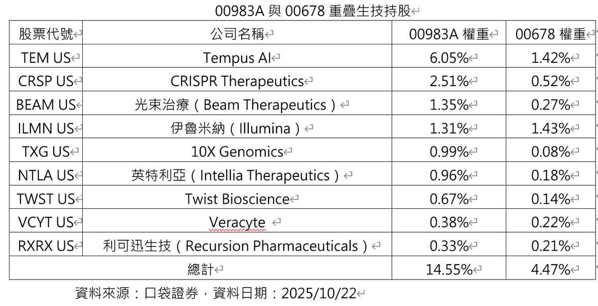 與00983A相同,00678也納入具顛覆性創新潛力的生技醫療公司,重疊持股包括Tempus、CRISPR、光束治療、伊魯米納等9檔。不過,00983A在這些標的的合計配置比重接近15%,明顯高於00678的約5%。若看好AI醫療、基因編輯等智慧醫療題材的成長潛力,00983A相對更具優勢。
