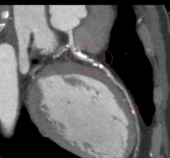 李學林表示,林先生日前接受肺癌篩檢時意外發現心血管鈣化,但無法確認是血管內或血管外鈣化。因患者平時已出現胸悶症狀,進一步做心臟冠狀動脈電腦斷層,確認為3條主要冠狀動脈血管內鈣化狹窄達85%以上,若未及時處理,隨時可能引發急性心肌梗塞。