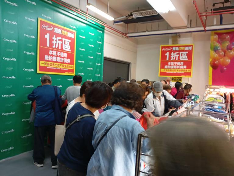 ▲鱷魚全系列商品包括男女休閒服飾、童裝、皮件、內著、帕襪、寢具等,數十萬件商品都以超低價1折起進行拋售,吸引消費者搶購。(圖╱記者孔亮云攝)