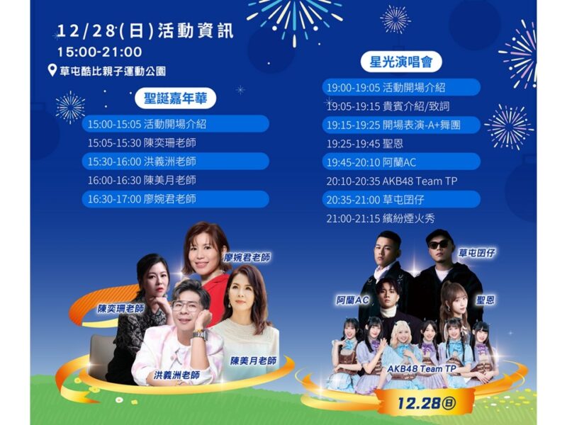 為迎接年末旅遊旺季,南投縣政府與草屯鎮公所首度攜手合作,整合在地教會與觀光資源,推出歷年規模最大的「草屯聖誕煙火嘉年華」。活動將於12月24日、27日及28日登場,不僅有連續三晚的璀璨煙火秀,更邀請安心亞、在地天團草屯囝仔等豪華卡司接力演出,打造草屯最熱鬧的冬季盛宴。
