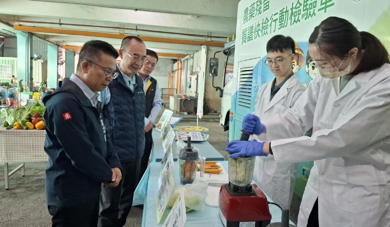 ▲農業局長姚志旺與梓官區農會總幹事林逸昌視察行動質譜車檢驗流程,行動質譜車可提供免費且速度快、準確度高的農藥殘留檢驗服務,協助農友即時掌握自家農產品安全狀況,守護食品安全。(圖/農業局提供)