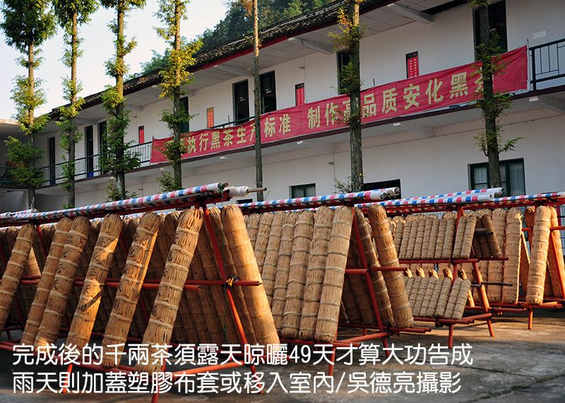 茶館橫跨資江兩岸,古色古香的建築成了縣城東坪鎮最顯著地標的「雲天閣」茶業,主人李雲係書法家出身,渾身散發優雅的文士氣息。他說千兩茶的製作工藝,比起普洱茶可說繁複多了:從採青、殺青、揉捻,到渥堆後烘乾,水分的高低、溫度濕度的控制,都有極其精確的計算。製成黑毛茶後尚須在七星灶上用松木烘烤,形成獨有的高香。再經揀梗、拼配,並秤重裝包,以每包7.5公斤、每五包才能填滿為一柱千兩茶。
