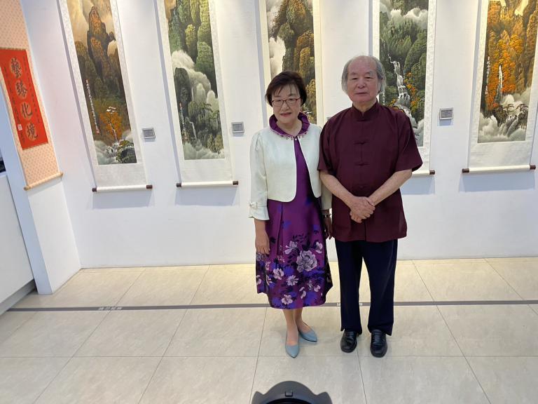 ▲劉玉美師從國際水墨大師葛憲能老師(右),葛老師也特別出席開幕式支持。(圖╱記者孔亮云攝)
