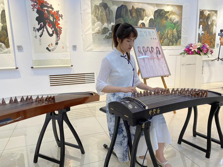 ▲開幕式邀請「云兮水月箏樂團」彭敬淇團長現場演奏箏樂彝族舞曲、菊花台、菊次郎的夏天等曲目,在墨韻流轉與箏樂聲悠揚中,現場來賓共同體驗一場融合人生?折與藝術昇華的文化饗宴。(圖╱記者孔亮云攝)