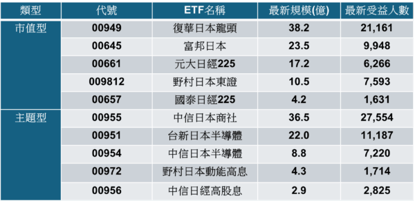 目前國內日股ETF分為市值型與主題型。若偏好主題式布局,可選商社或半導體相關ETF,如中信日本商社(00955)、台新日本半導體(00951)與中信日本半導體(00954)。但專家提醒,單一產業波動較大,配置時須評估風險承受度。