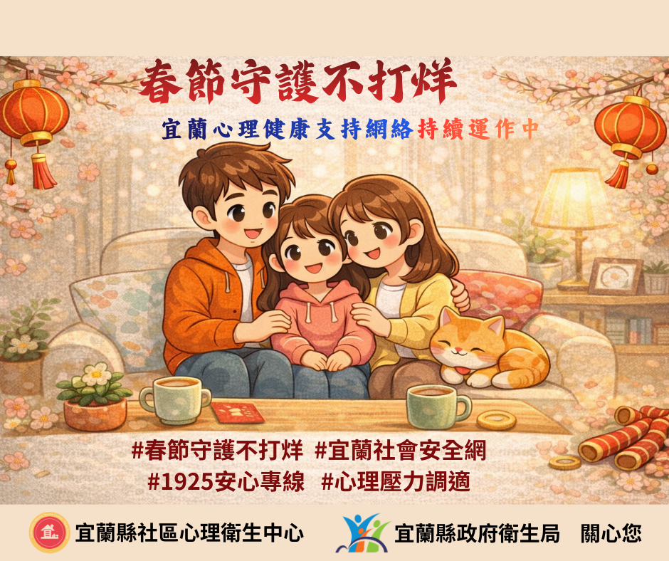 四、心理支持資源不打烊:即便在年節期間,我們的心理防護網依舊運作。若感到情緒難以平復,請利用衛生福利部24小時免費心理諮詢服務「1925安心專線」,我們會提供及時的關懷及支持。