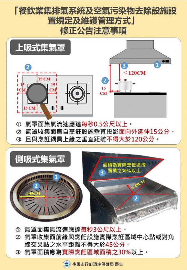 為從源頭改善餐飲油煙對居住環境與民眾健康的影響,桃園市政府全面加強餐飲業油煙管理制度。桃園市環保局於115年1月13日正式修正公告相關規定,明確將餐飲油煙防制從「只要有裝設備」提升為必須「裝得有效、用得正確、定期保養」的管理模式,明確訂定集氣效能量化標準及設備維護紀錄要求,並規劃一年輔導期,於116年1月1日起正式施行。