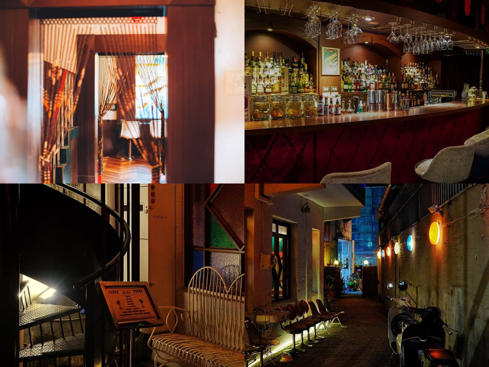很有懷舊風情的萬吧 One Bar,店面由三棟老宅打通,1、2樓是萬吧餐廳,走到巷子底就能看到通往3樓的旋轉鐵梯,寬度只能容得下一人,看來喝酒前是得經過一點考驗。打開門的瞬間便穿越進了昭和摩登的年代,從家具、擺設、燈飾、地毯甚至是壁紙都是講究,有個性的萬吧是無酒單客製化特調,你想喝甚麼,調酒師都能為你調出滿意的味道,建議再點一道陳年花雕雞麵,保證你會愛上這個味道。夜晚華燈初上,萬吧 One Bar獨特的魅力正等著你來體驗。